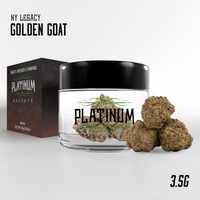 Golden Goat is a classic sativa-dominant hybrid that delivers a bright, citrus-sweet experience with upbeat, social effects as sunny and energizing as a fresh squeeze of lemon over tropical fruit. This lively cultivar starts with a clear-headed cerebral lift that sparks happiness, creativity, and easy conversation before easing into a light, functional body calm that keeps you moving. Golden Goat features a vibrant flavor of sweet citrus and tropical fruit layered with soft pine, herbal spice, and a gentle earthy finish. The aroma is equally inviting, with zesty citrus peel, sweet fruit, and faint skunk that becomes louder when the dense, frosty buds are broken apart. Patients often value Golden Goat for supporting relief from stress, low mood, and fatigue while maintaining a productive, daytime-friendly high. Feelings: Energetic, Uplifted, Creative